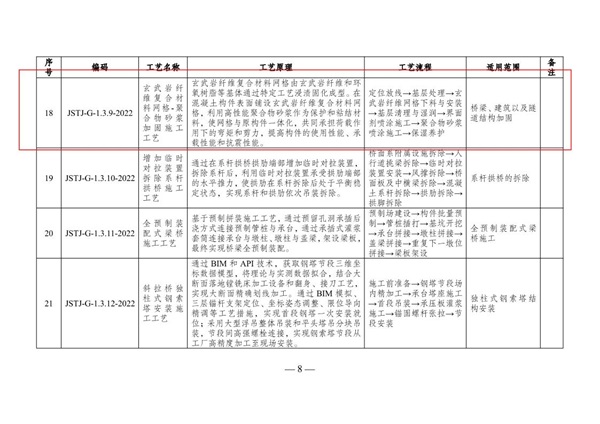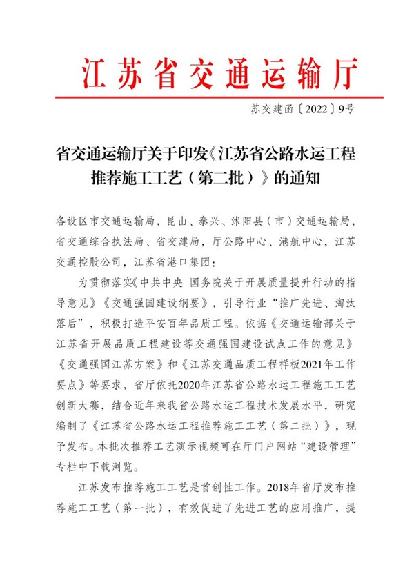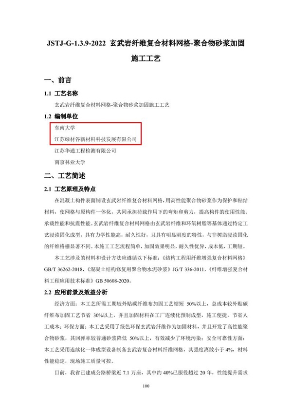近日,江苏省交通运输厅发布关于印发《江苏省公路水运工程推荐施工工艺(第二批)》的通知,由绿材谷科技与东南大学主编的“玄武岩纤维复合材料网格-聚合物砂浆加固施工工艺”作为2020年江苏公路水运工程施工工艺创新大赛三等奖作品(位列229份参赛作品第7名)成功入选。